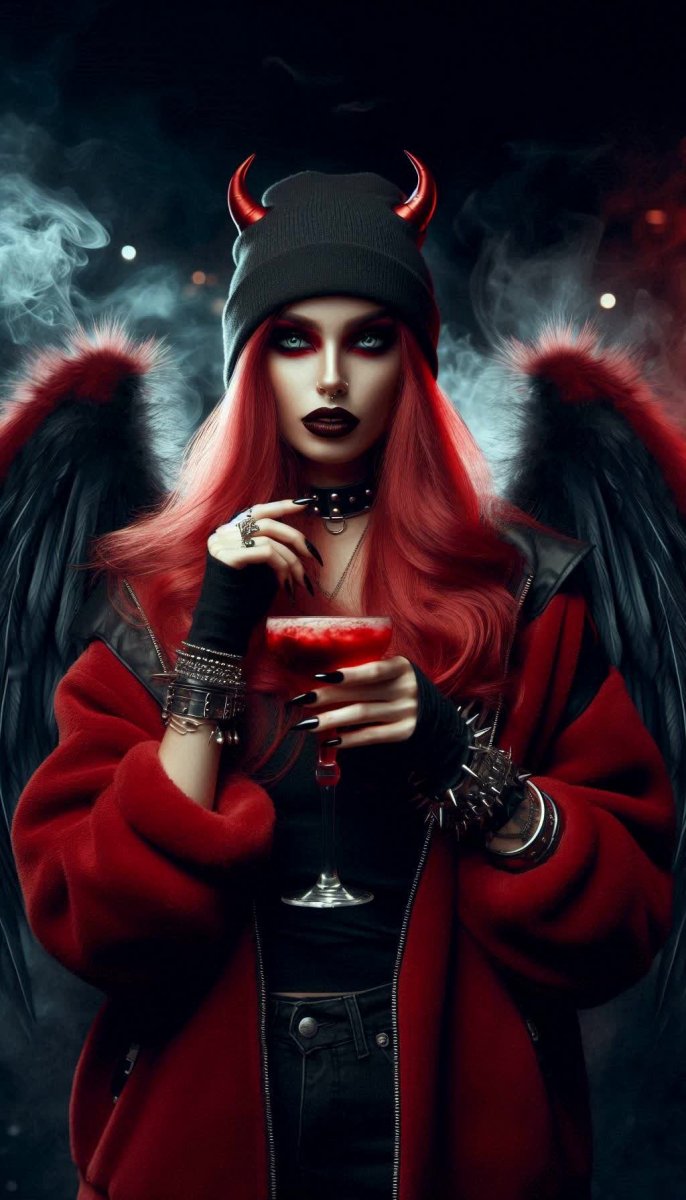 #4 a professional photo predatory red-haired vampire girl in a black-red down jacket, metal bracelets, black choker, beanie hat with pointed ears, bright scarlet lips, fiery cocktail in her hands, foggy black night city backdrop, demon wings at feet #role_real