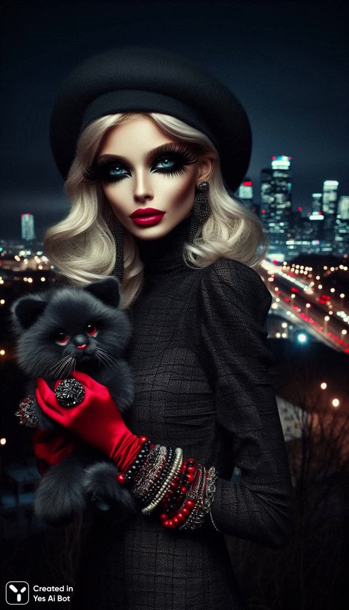 #1. профессиональная фотография: ночной городской пейзаж в стиле ретро, элегантная блондинка с короткой стрижкой и чёрными длинными ресницами, ярко-красные губы, одета в авангардный чёрно-красный мини-платье, массивные браслеты и хокер. в руке — плюшевый чёрный кот, на голове — чёрная шапка-бини с рожками, лёгкие текстуры старой плёнки, немного сюрреализма #role_real