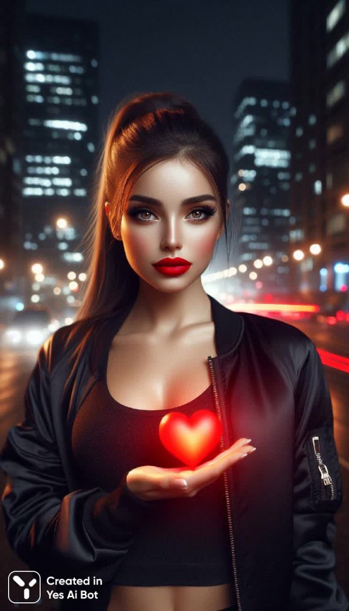 #2 a professional photo night city portrait, sporty cool girl, fit, crop top, black bomber jacket, lady fitness, bright scarlet lipstick, black eyelashes, a red heart rising from her palm, retouched, dark city street backdrop. #role_real