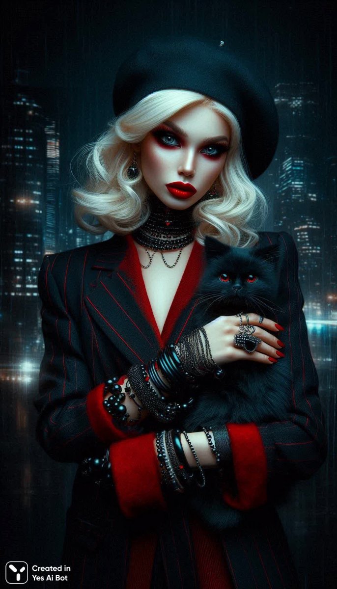 #1 a professional photo elegant blonde goth girl, black and red suit, scarlet lips, emotional face, retro film textures, black beanie hat, massive bracelets, a plush cat, darkened cityscape background, surrealism and abstraction. #role_real