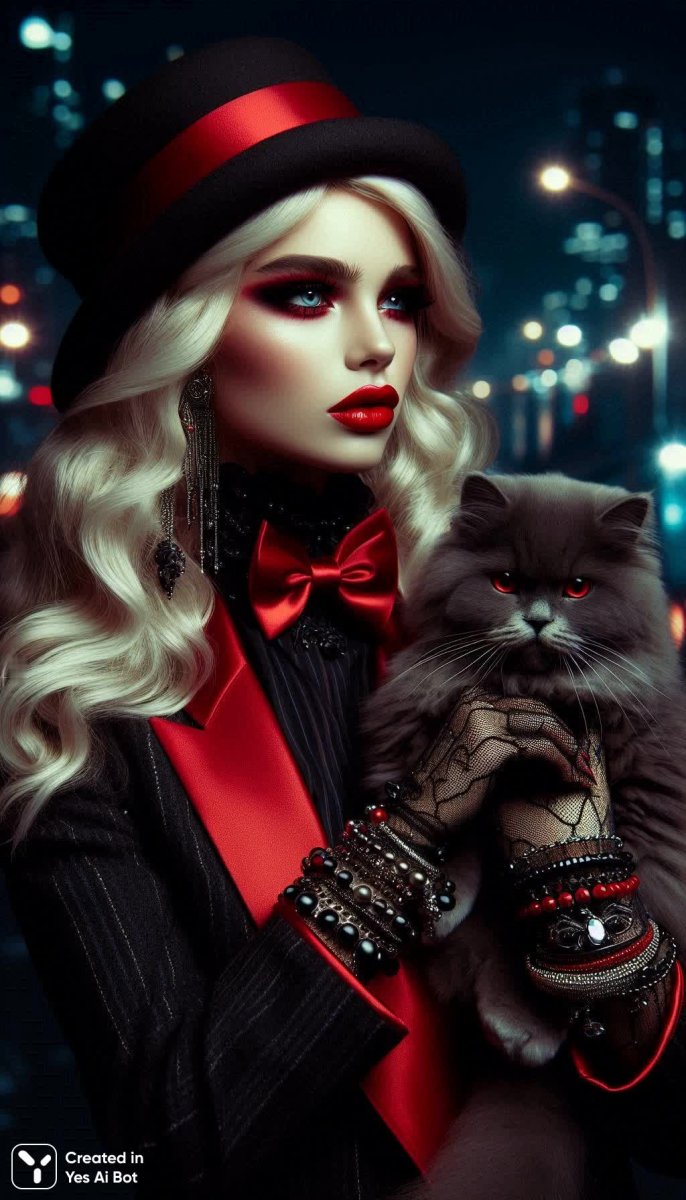 Загадочная и притягательная фотография, где элегантная блондинка в готическом стиле предстает перед зрителем в эффектном черном и красном костюме. На ее губах – дерзкий оттенок алого цвета, подчеркивающий эмоциональность лица и придающий образу особую глубину. Ретро-текстуры пленки создают ощущение ностальгии и добавляют снимку винтажной атмосферы. Черная шапка-бини придает образу современный акцент, а массивные браслеты – нотку бунтарства. Неожиданным дополнением является плюшевый кот, который создает контраст между готическим стилем и уютом. На заднем плане – мрачный городской пейзаж, погруженный в полумрак, что усиливает ощущение загадочности и таинственности. Фотография выполнена в стиле сюрреализма и абстракции, благодаря чему она приобретает уникальный художественный смысл и вызывает множество интерпретаций. Это не просто портрет, а целая история, рассказанная с помощью визуальных образов – история о красоте, силе, эмоциях и скрытых глубинах человеческой души. Каждое деталь тщательно продумана и создает гармоничный ансамбль, который захватывает внимание зрителя и не отпускает его. Работа представляет собой яркий пример современного искусства, сочетающего в себе классические элементы с инновационными подходами к композиции и цветовой гамме