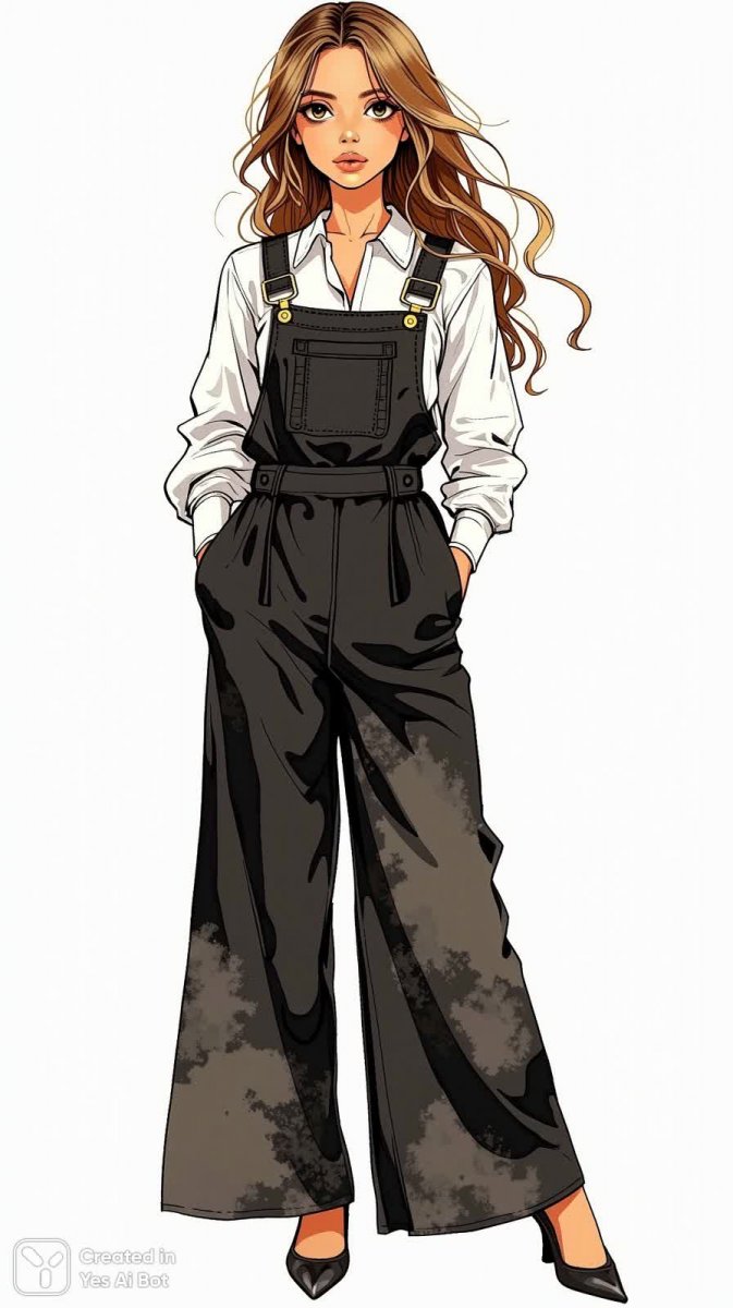 zentangle, young woman posing in formal outfit, black pinafore top over a white shirt, long flowing skirt paired with black trousers, loose waves hairstyle, hands in pockets #role_moda