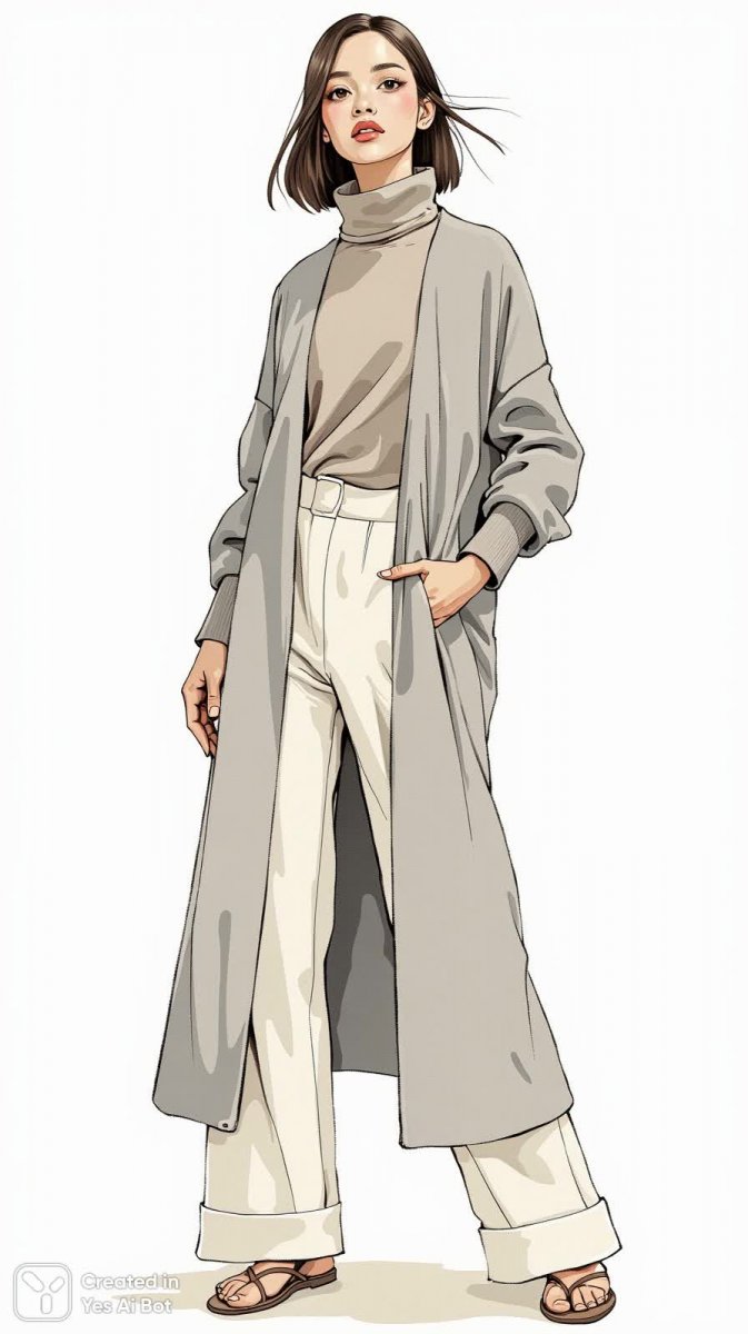 Элегантная и утонченная иллюстрация демонстрирует современный образ в стиле минимализм. В центре внимания – женщина с изысканным стилем, одетая в длинный серый кардиган с высоким воротником, подчеркивающий ее элегантность и создающий ощущение тепла и комфорта. Простой белый фон акцентирует внимание на деталях образа, позволяя полностью оценить гармоничное сочетание цветов и текстур. Широкие брюки добавляют образу непринужденности и легкости, а стрижка боб создает эффектную и современную прическу, идеально подходящую к общему стилю. Минималистичный макияж подчеркивает естественную красоту модели, не отвлекая внимания от одежды и общей композиции. Поза модели, выполненная для модной съемки, излучает уверенность и стиль, передавая атмосферу изысканности и элегантности. Вся работа выдержана в духе современной моды, демонстрируя актуальные тенденции и предлагая вдохновение для создания стильных и лаконичных образов. Это идеальный пример того, как простота может быть выразительной и запоминающейся, а грамотное сочетание деталей создает неповторимый и эффектный вид. Иллюстрация представляет собой визуальное воплощение современной элегантности и минималистичного стиля, подчеркивая важность детализации и гармонии в создании модного образа