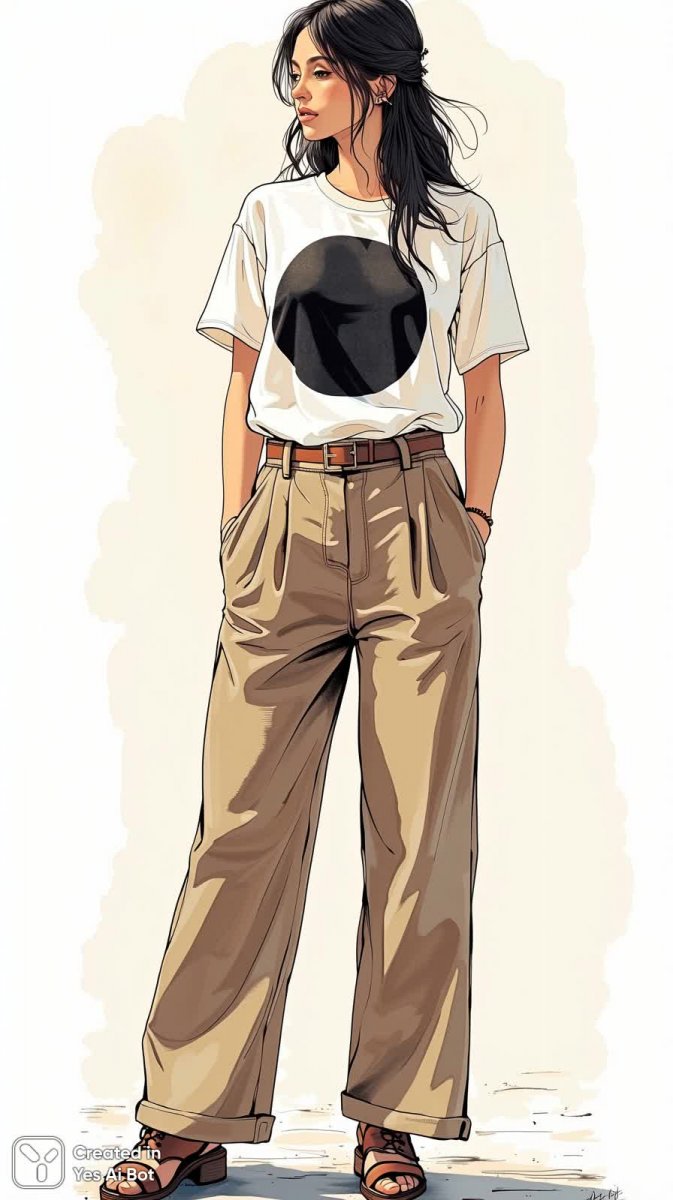 ink drawing, young woman standing in studio, black circular design on a white t-shirt, high waistline trousers with relaxed fit, looking off to side, loose waves. #role_moda