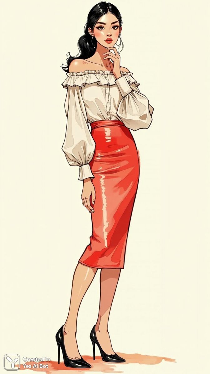 naive art, young woman posing with one hand on hip and other resting on chin, black high heels with pointed toe, ruffled neckline, minimal makeup. #role_moda