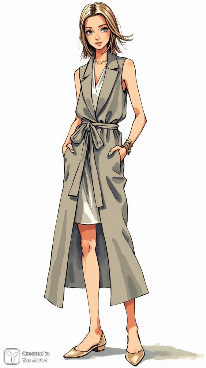 illustration, woman wearing long gray cardigan over a sleeveless vest, cinched at waist with belt, lightweight fabric, sleek bob hairstyle, hands in pockets. #role_moda