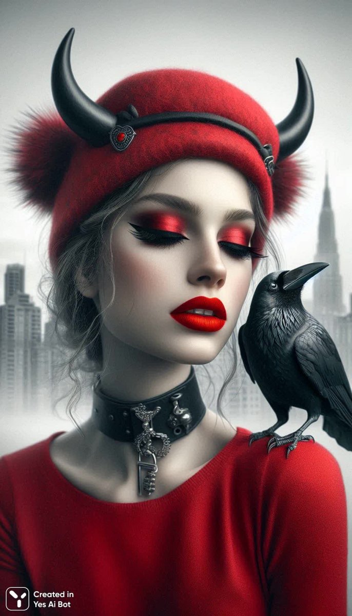 Загадочная встреча в сумеречной атмосфере города. Эта фотография запечатлевает момент глубокого эмоционального напряжения, где современная красота сочетается с элементами мистики и бунтарства. Девушка в дерзком стиле бимбо, одетая в красный топ и черную чокер, приковывает внимание своей яркой внешностью. Ее лицо, выражающее сложную гамму чувств, подчеркнуто вызывающим алого цветом помады и длинными ресницами, создавая образ одновременно хрупкий и сильный. На голове у нее скандинавская шапка с рожками – символ скрытой силы и связи с древними традициями. Рядом с ней, словно посланник потустороннего мира, восседает черный ворон, добавляющий снимку атмосферу таинственности и предзнаменования. Монохромный городской пейзаж на заднем плане создает ощущение отрешенности от реальности, подчеркивая внутренний мир героини. Легкий намек на гранжевую мелодию в визуальном ряде привносит нотку меланхолии и бунтарства, завершая образ сложной и многогранной личности. Эта фотография – не просто портрет, а целая история, рассказанная языком цвета, света и символов, способная вызвать широкий спектр эмоций и заставить задуматься о скрытых смыслах жизни. Это визуальная поэма о красоте, страсти и внутренней борьбе, воплощенная в одном кадре