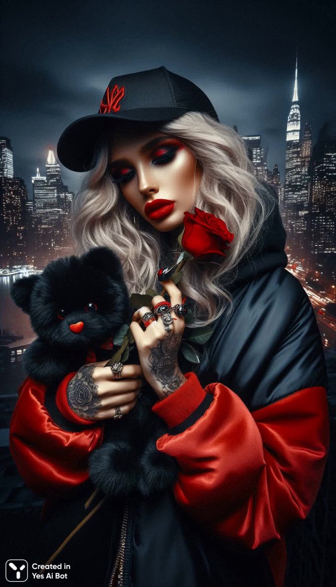 Ночной городской пейзаж, запечатленный профессиональным фотографом, создает атмосферу меланхолии и утонченной драмы. В центре внимания – молодая женщина с золотистыми волосами, облаченная в объемный черный и красный пуховик, дополненный бейсболкой и внушительными браслетами. Яркая красная помада подчеркивает ее эмоциональное выражение лица, а взгляд полон задумчивости и скрытой печали. В руках она нежно держит алую розу – символ любви и страсти, контрастирующий с мягким силуэтом плюшевого черного кота. Музыкальный фон в виде гранж-мелодии усиливает общее настроение композиции, а затемненный фон придает сцене глубину и загадочность. Легкая ретро-текстура добавляет изображению ностальгическую окраску, словно кадр был сделан в эпоху ушедшей моды и стиля. Вся сцена пронизана ощущением одиночества, внутренней борьбы и хрупкости человеческих чувств, воплощенных в образе девушки с розой и котом на фоне мерцающего ночного города. Это не просто фотография – это визуальная поэма о любви, потере и стремлении к красоте в мире, полном контрастов и противоречий. Камера запечатлела момент искренней эмоции, переданный через детали одежды, выражение лица и символические предметы, создавая незабываемое впечатление для зрителя