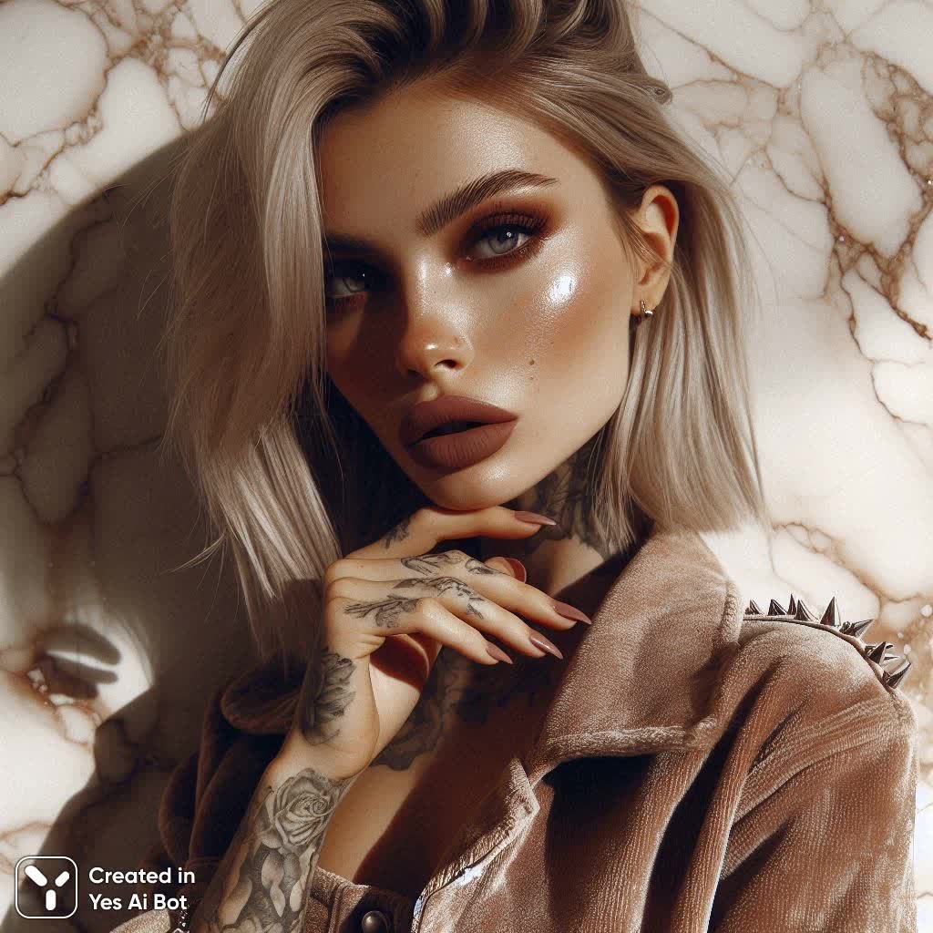 Завораживающая атмосфера ностальгии и бунтарского духа сплетаются в этом визуальном образе. Фотография, словно выхваченная из старого кинохроники, дышит историей благодаря эффекту плёнки, зернистости и деликатным помехам. Мраморные узоры и трещины добавляют текстурности и глубины, а бежевый глинч эффект создает мягкое рассеянное освещение, окутывающее сцену в теплое свечение. В центре внимания – стильная девушка, воплощающая эстетику gangsta-шика с элементами гранжа. Её белобежевые прямые волосы, украшенные бархатной лентой с шипами, контрастируют с дерзким гранж-макияжем и темными матовыми губами насыщенного бордового оттенка. Выразительная гримаса и приподнятый носик придают портрету игривости и живости. Одежда девушки – это гармоничное сочетание дерзости и элегантности: черная косуха с ремнями и клепками, серый свитшот с белым воротником, серая плиссированная юбка и высокие сапоги на платформе с гольфами. Игра теней подчеркивает объем и фактуру, создавая ощущение динамики и движения. Сверкающие шары, пузыри и матовый фон завершают композицию, добавляя ей воздушности и легкости. Это визуальное повествование о силе характера, индивидуальности и непокорном духе, запечатленное в стиле ретро-эстетики с современным акцентом