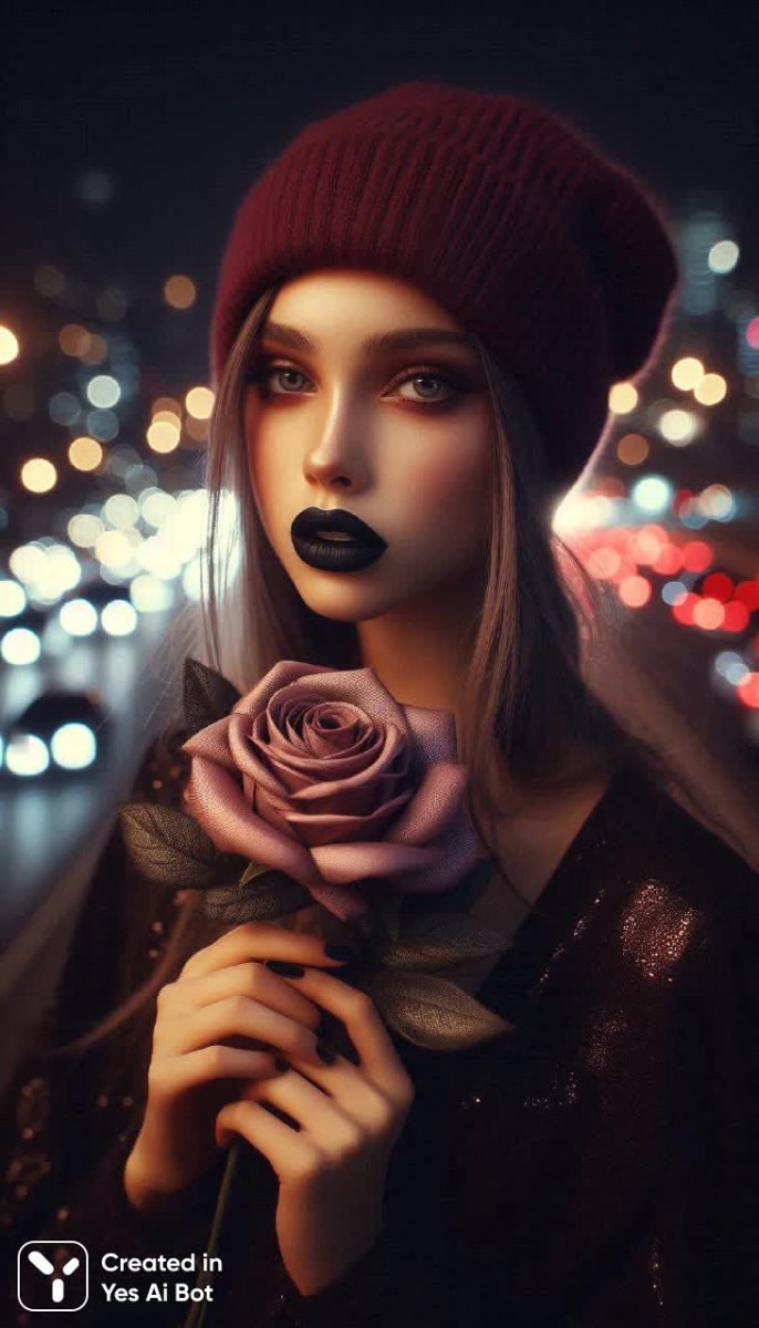 #2 профессиональное фото, эффект двойной экспозиции, девушка в черных шортах и бордовой бини, с черной губной помадой, в руках пыльно-розовая роза, городские огни на заднем плане, атмосфера ностальгии, мягкое освещение, стилистика ретро. #role_real