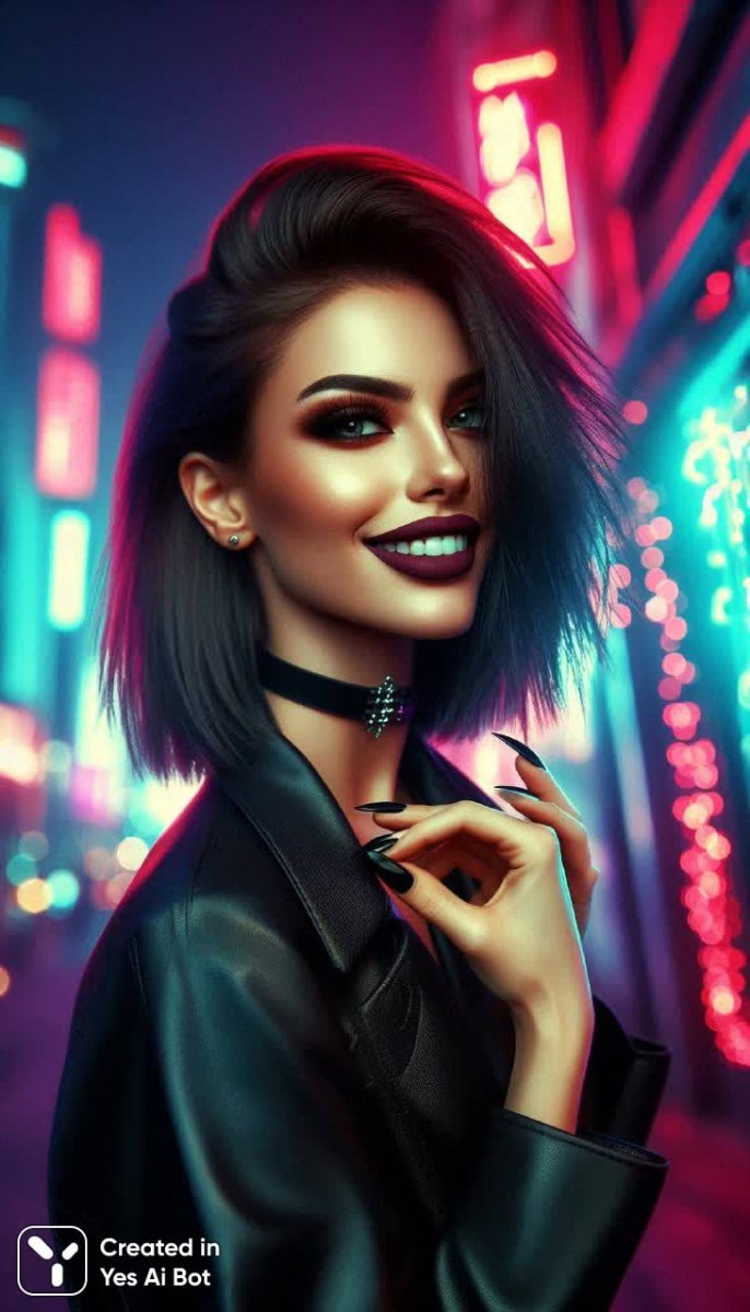 #1. профессиональная фотография, хулиганка девушка с короткими волосами и чокером, черная кожаная куртка, бордовая помада, длинные черные ногти, улыбается, на фоне неонового городского пейзажа, яркие огни и дымка создают атмосферу загадки #role_real