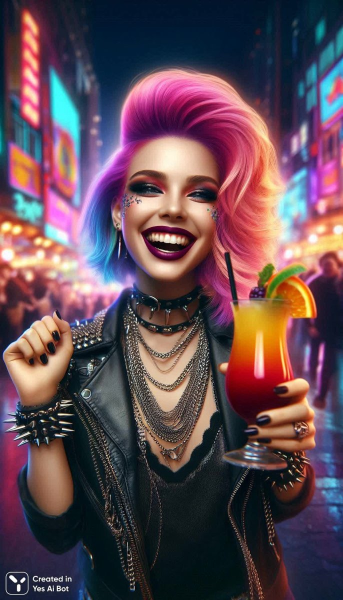 #5. профессиональная фотография, хулиганка с короткими волосами и громким смехом, черный кроп-топ, шорты и цепи на бедрах, бордовая помада, улыбается, в руках стакан с фруктами на фоне яркого ночного города #role_real