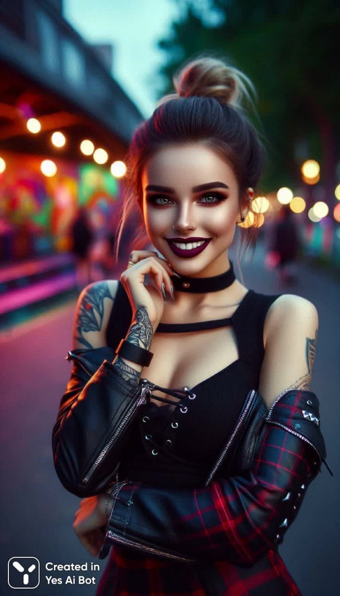 Яркий портрет молодой девушки, излучающей энергию и уверенность. В кадре – стильная пацанка в черном топе с эффектной рваной отделкой, подчеркивающей ее дерзкий характер. Акцент на выразительные бордовые губы и изящную татуировку на запястье добавляет образу глубины и индивидуальности. Длинные аккуратные ногти завершают тщательно продуманный стиль. Фотография выполнена в неформальной обстановке – на фоне красочных граффити оживленного студенческого района, что создает неповторимую атмосферу молодости и свободы. Вечернее освещение придает снимку особую теплоту и загадочность, подчеркивая настроение беззаботности и легкости. Вся композиция пронизана динамикой и позитивом, передавая ощущение момента, запечатленного профессиональным фотографом. Это не просто портрет, а настоящая история, рассказанная языком стиля и визуального искусства. Каждая деталь – от яркого макияжа до граффити на заднем плане – работает на создание целостного и запоминающегося образа, который отражает дух времени и индивидуальность модели. Фотография идеально подойдет для использования в рекламных кампаниях, социальных сетях или в качестве иллюстрации к статье о моде и молодежной культуре, демонстрируя смелый стиль и неповторимый характер современной девушки