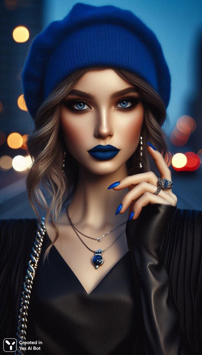 #2. профессиональная фотография, девушка в черном платье-бандаж, синий лак для ногтей, широкие бедра, на голове синий бини, дерзкий взгляд и яркая синяя губная помада, вечерний городской фон, стильные аксессуары, чувственная атмосфера #role_real