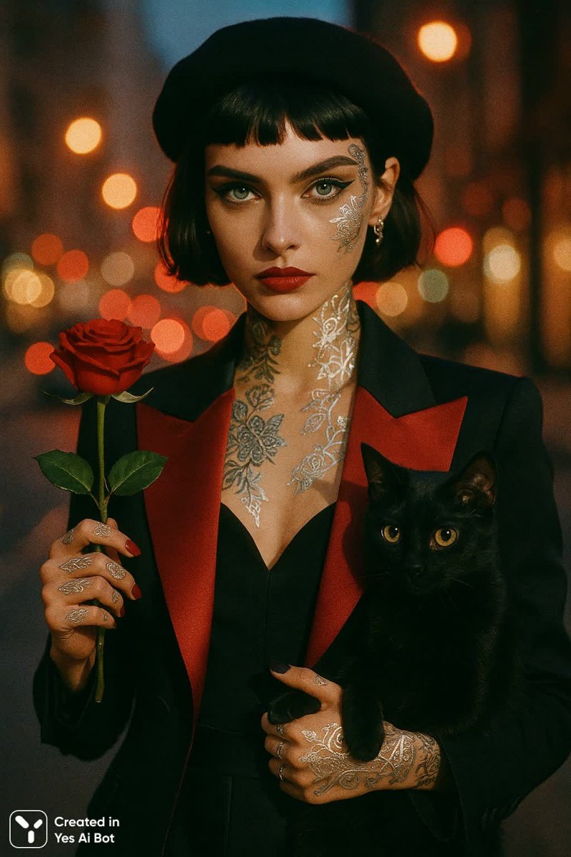 a trendy lady with piercing eyes captivates in a stunning black and red outfit, adorned with bright sterling silver tattoos. She holds a vibrant red rose in one hand and her adorable black cat in the other, surrounded by the magical glow of the romantic city lights. The retro effects add depth to the mysterious atmosphere, highlighting her bold presence.