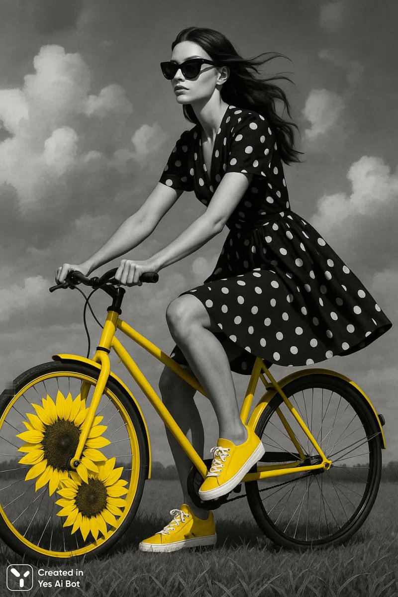 #2 monochrome, bw digital art, bright yellow accent on sneakers, woman riding on grassy field with bright yellow bicycle, wearing a black polka dot dress and sunglasses, large sunflowers on front wheel, BG is cloudy sky with fluffy clouds #role_yellow_accent