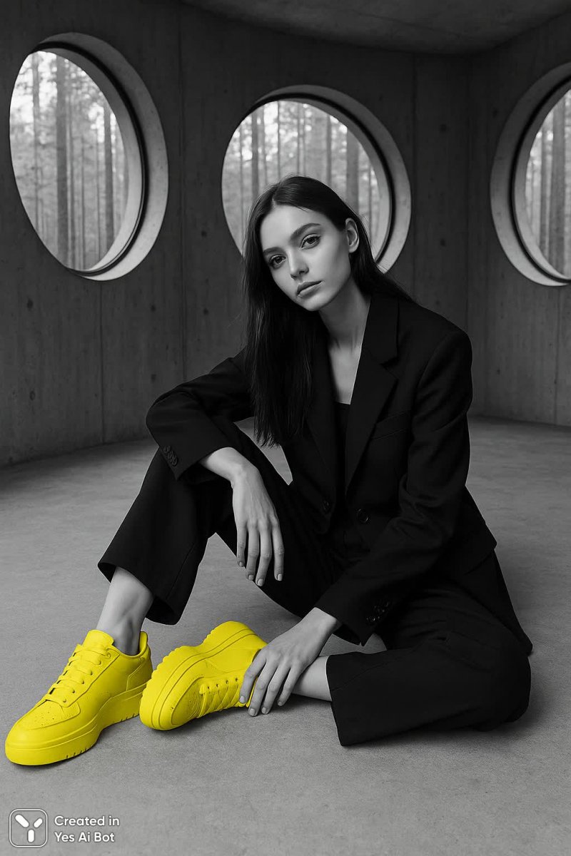 Завораживающая черно-белая цифровая иллюстрация передает атмосферу умиротворения и созерцания. В центре композиции – молодая женщина, сидящая на полу в минималистичном бетонном помещении с множеством круглых окон. Ее поза расслабленная: руки покоятся на коленях, а голова слегка наклонена вбок, словно она погружена в глубокие мысли или наблюдает за происходящим снаружи. Яркий желтый акцент на кроссовках добавляет неожиданный всплеск цвета в монохромную палитру и привлекает внимание к деталям ее образа. Длинные волосы мягко обрамляют лицо, подчеркивая нежность и утонченность. На заднем плане простирается густой лес с высокими деревьями, создавая ощущение простора и единения с природой. Игра света и тени в бетонных стенах и сквозь круглые окна усиливает эффект глубины и загадочности. Картина вызывает чувство спокойствия и позволяет зрителю на мгновение остановиться и задуматься о красоте простых вещей. Эта работа – пример гармоничного сочетания минимализма, абстракции и реалистичных деталей, создающих неповторимую атмосферу и эмоциональный отклик. Композиция пронизана тихой элегантностью и тонким чувством стиля. Впечатление усиливается за счет тщательно подобранной цветовой гаммы и мастерски выполненного освещения