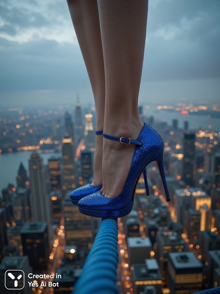 Изящный баланс на грани риска: хрупкая женская фигура, чьи ноги уверенно покоряют толстую синюю верёвку, паря над бурлящим великолепием Нью-Йорка. В центре внимания – изысканные ступни, облачённые в сверкающие туфли на высоком каблуке цвета королевского сапфира. Блестящая текстура этих элегантных шпилек отражает свет, создавая ощущение волшебства и роскоши, а тонкие ремешки на щиколотке добавляют образу завершённости и утончённости. Кожа ног слегка влажна, покрыта каплями воды, словно напоминая о недавней встрече с туманом или дождём, что лишь усиливает драматизм момента. За спиной раскинулся бескрайний городской пейзаж – знакомый силуэт Нью-Йорка, уходящий вдаль и слегка размытый в фокусе. Бесчисленные небоскрёбы, залитые мягким светом городских огней, создают ощущение тепла и уюта, контрастируя с напряжённой атмосферой происходящего на переднем плане. Небо над городом затянуто облаками, а приглушённые цвета плавно перетекают друг в друга, создавая завораживающий эффект. Картина пронизана духом смелости и элегантности, сочетая в себе опасность и красоту. Мягкое, но направленное освещение акцентирует внимание на ступнях и ногах, выделяя их на фоне размытого городского пейзажа. Архитектурный стиль зданий соответствует современному городскому дизайну с элементами ар-деко, добавляя изображению шарма и изысканности. Это уникальная визуальная история, где гламур переплетается с духом приключений, оставляя зрителя в состоянии напряжения и восхищения