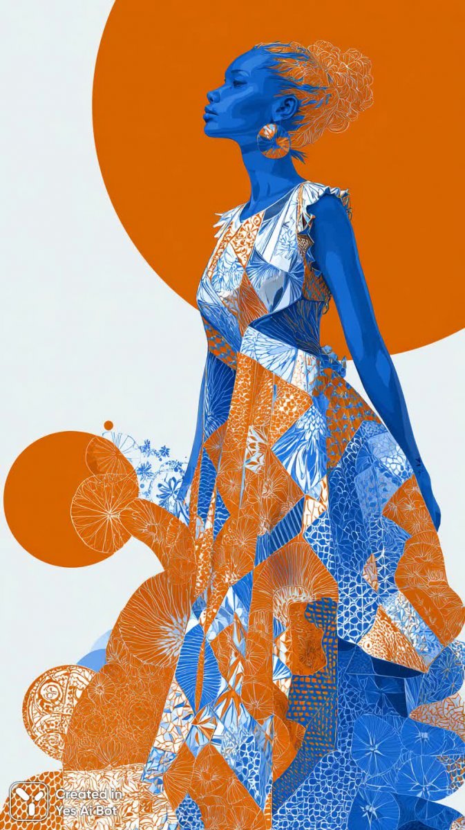 произведение современного искусства, изображающее женский облик в ярких оранжевых и синих тонах, замысловатые узоры, сливающиеся с белоснежной обстановкой, роскошь и современный шарм, переплетенные в завораживающей композиции.