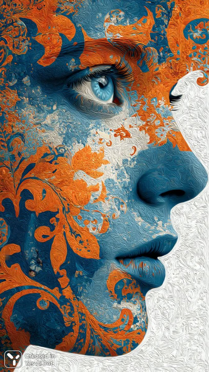 Изящный женский портрет, воплощающий собой гармонию цвета и формы, представляет собой захватывающее визуальное исследование абстрактного дизайна макияжа. На фоне чистейшего белого полотна раскрывается лицо, словно холст для смелых цветовых решений. Оранжевые и синие цветы, выполненные в изысканных узорах, танцуют по коже, создавая поразительный контраст, который притягивает взгляд и будоражит воображение. Гиперреалистичные детали подчеркивают мастерство исполнения, позволяя зрителю рассмотреть мельчайшие нюансы текстуры кожи и тонкие переходы оттенков. Яркая цветовая палитра наполняет композицию энергией и жизненной силой, создавая ощущение праздника и вдохновения. Смелый и современный художественный стиль отражает стремление к инновациям и эксперименту в мире красоты и искусства. Эта работа – не просто портрет, а манифест креативности, выраженный через гармоничное сочетание реализма и абстракции. Она воплощает собой идею о том, что красота может быть не только естественной, но и созданной, трансформированной посредством смелых художественных решений. Этот образ – гимн женственности, силы и индивидуальности, вдохновляющий на самовыражение и творческие поиски. Он призывает нас видеть прекрасное в неожиданных сочетаниях и ценить уникальность каждого момента. Использование ярких цветов и контрастных элементов создает ощущение динамики и движения, заставляя зрителя погрузиться в мир фантазий и мечтаний