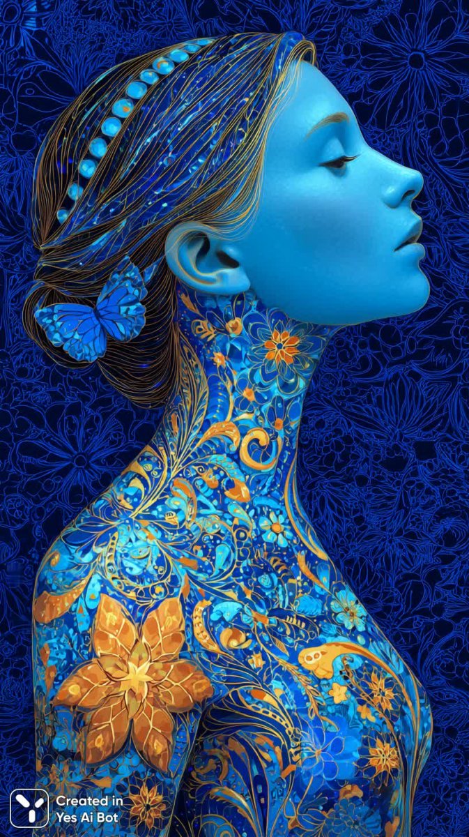 Воплощение эфемерной красоты и загадочной силы, эта композиция представляет собой визуальный гимн гармонии контрастов. Женщина, словно сошедшая с полотен сновидений, становится холстом для поразительного боди-арта – симфонии синих и оранжевых оттенков, переплетающихся в замысловатые узоры. Эти линии, словно живые нити, тянутся по ее лицу, подчеркивая изящество черт и придавая образу неземную притягательность. Мягкое белое сияние, окутывающее сцену, создает атмосферу таинственности и возвышенности, словно свет далекой звезды освещает это мимолетное видение. Игра света и тени подчеркивает глубину узоров боди-арта, делая их еще более выразительными и завораживающими. Каждый штрих, каждое переплетение линий продумано до мельчайших деталей, создавая ощущение совершенства и гармонии. Композиция пронизана сюрреалистической сущностью – она выходит за рамки привычного восприятия реальности, погружая зрителя в мир фантазий и грез. Высокое разрешение изображения позволяет рассмотреть каждую деталь с поразительной четкостью, усиливая эффект присутствия и позволяя зрителю полностью раствориться в этой завораживающей картине. Это не просто изображение – это портал в другой мир, где красота и тайна переплетаются воедино, создавая незабываемое впечатление. Она - живое воплощение искусства, способного вдохновлять и пробуждать самые сокровенные чувства
