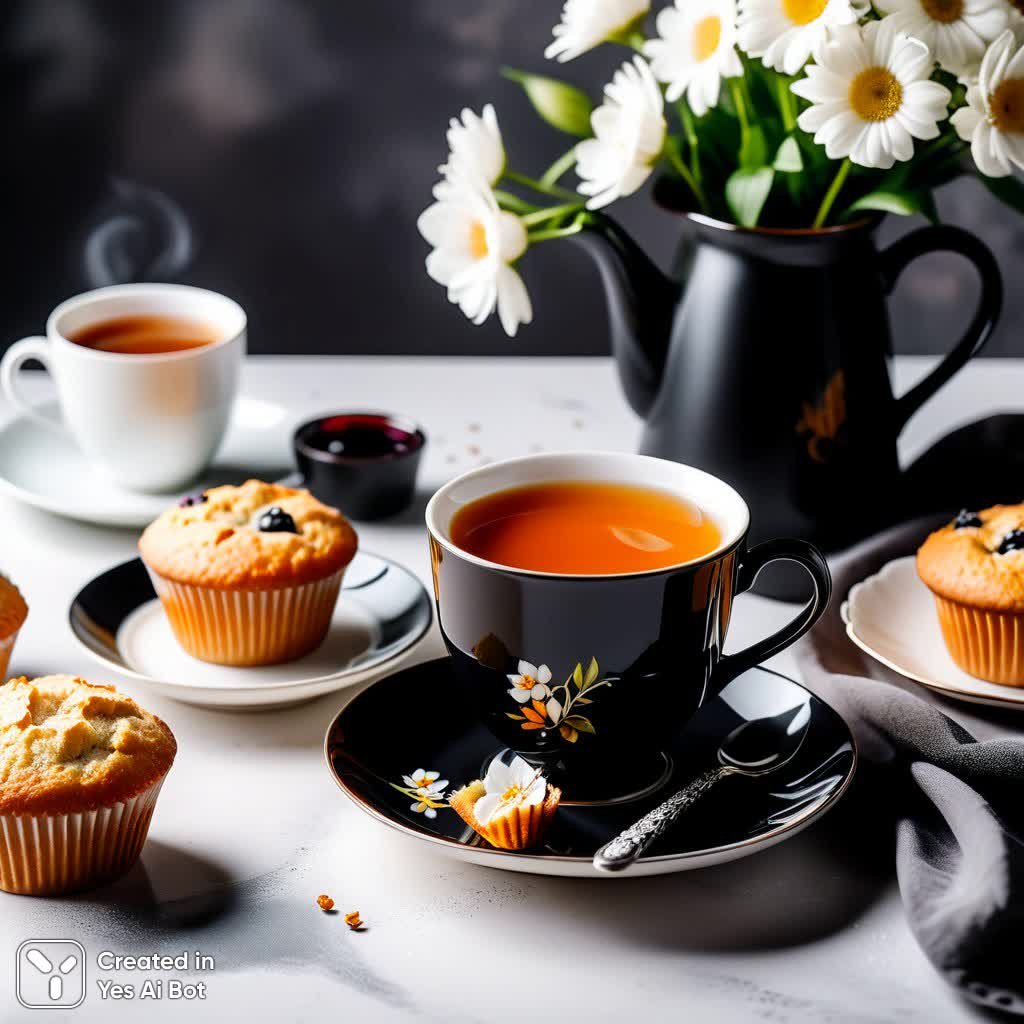 Изысканная сцена утреннего чаепития запечатлена в профессиональной фотографии с ярким студийным освещением. Тёплый чёрный чай из горячего напитка элегантно льётся в прекрасную фарфоровую чашку, украшенную тонкой живописной росписью. Рядом располагается аппетитная тарелка с нежными маффинами, создающими атмосферу домашнего уюта и комфорта. В вазе изящно расцветает белоснежный букет цветов, добавляющий композиции свежести и лёгкости. Качество снимка безупречно благодаря использованию профессиональной зеркальной камеры – DSLR с высоким разрешением (HQ). Угол съёмки выполнен сверху – высокий угол, что позволяет взглянуть на сцену в целом, подчеркнув гармонию всех деталей. Центральная композиция фокусирует внимание зрителя на ключевых элементах изображения, создавая ощущение равновесия и порядка. Яркий фон и высокотональное освещение (High-key lighting) придают снимку воздушность, лёгкость и позитивный настрой, делая его визуально привлекательным и запоминающимся. Это идеальный образ для иллюстрации уютных моментов наслаждения чашкой ароматного напитка в приятной обстановке. Каждая деталь продумана до мелочей, создавая ощущение совершенства и гармонии