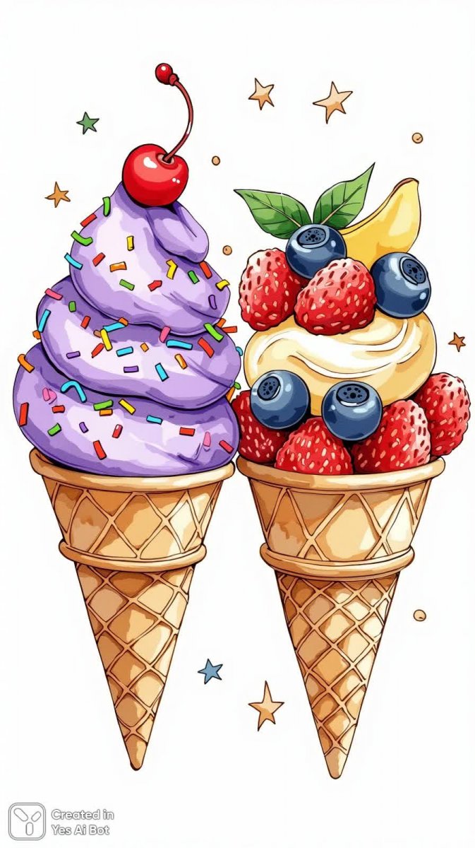 #3 doodling of two whimsical ice cream cones, one with purple mint ice cream topped with colorful sprinkles and a cherry, the other filled with various fruits like blueberries and strawberries, BG is white with hand-drawn stars. #role_coloring_book