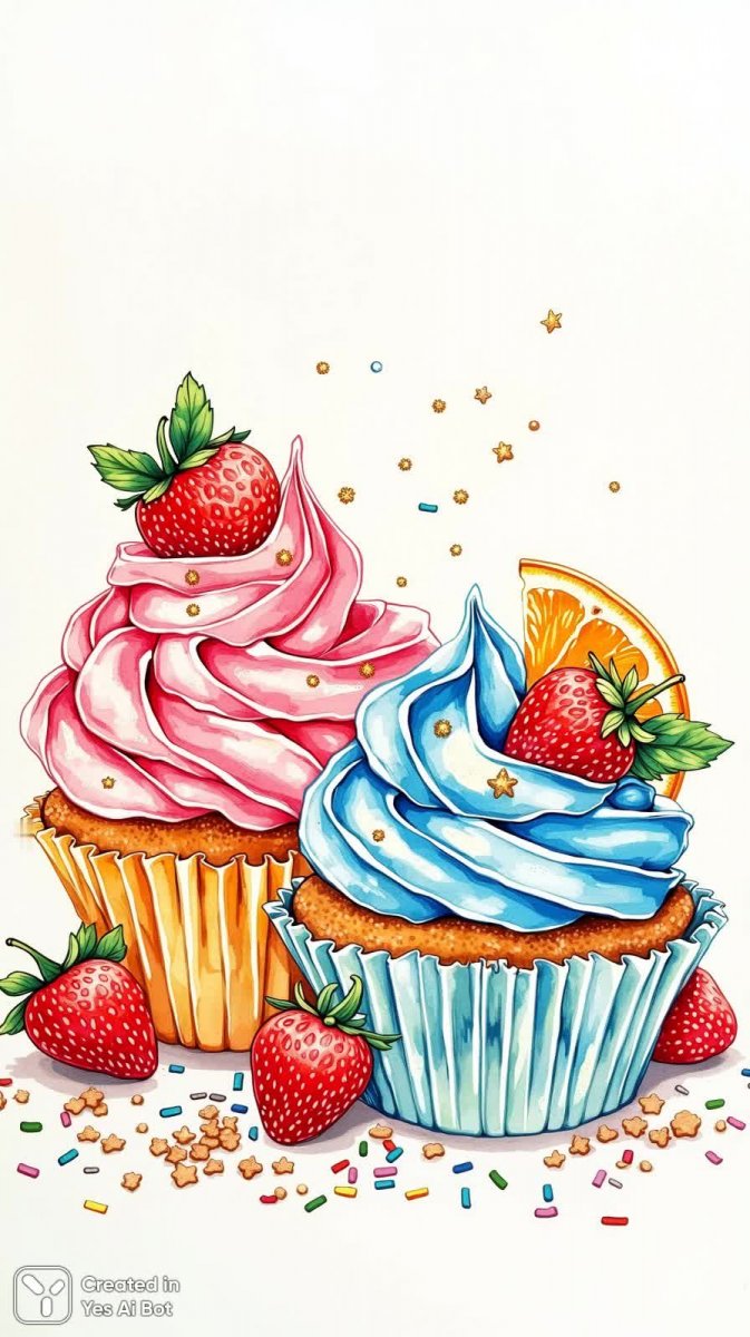 Яркий и аппетитный рисунок в технике туши изображает два красочных кекса с нежным розовым и голубым кремом. Каждый из них украшен свежей клубникой и ароматными листиками мяты, создавая ощущение летнего настроения и сладкого блаженства. Один из кексов искрится золотыми блёстками, добавляя ему волшебства и праздничности, а вокруг причудливо разбросаны разноцветные посыпки, словно конфетти на детском празднике. Рядом с десертами лежит аппетитный ломтик апельсина, который оттеняет яркие цвета кексов и добавляет композиции свежести и цитрусового аромата. Фоном для этой сладкой картины служит чистый белый цвет, подчеркивающий яркость и жизнерадостность изображения. Рисунок выполнен в игривом стиле, что делает его идеальным для использования в качестве иллюстрации к раскраске или детской книге, вызывая улыбку и желание создать свой собственный шедевр. Это настоящее произведение искусства, которое дарит ощущение радости, тепла и беззаботности, а также пробуждает аппетит и вдохновляет на кулинарные эксперименты. Насладитесь красотой этой сладкой сцены, полной ярких красок и деталей