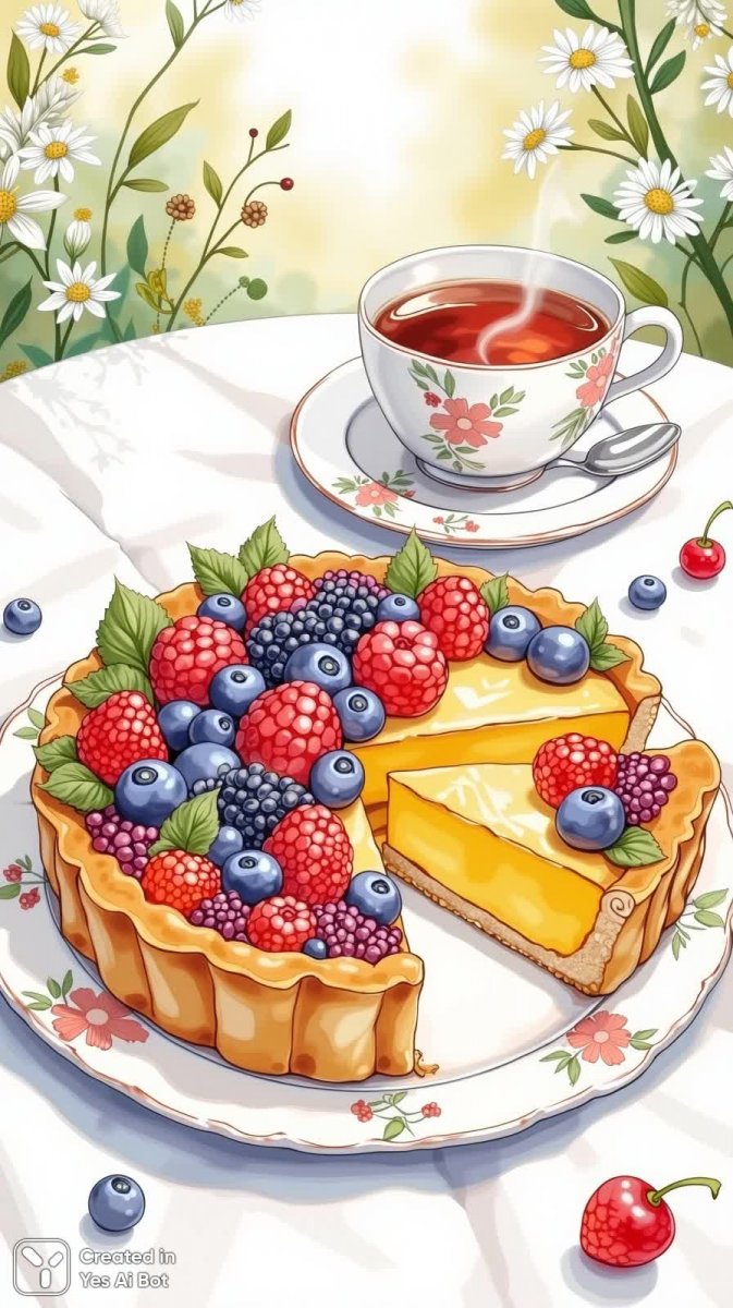 #5. folk art of a whimsical dessert tart with a slice taken out, golden crust with yellow filling and topped with a variety of berries, placed on a white table with a cup of berry tea in the background #role_coloring_book