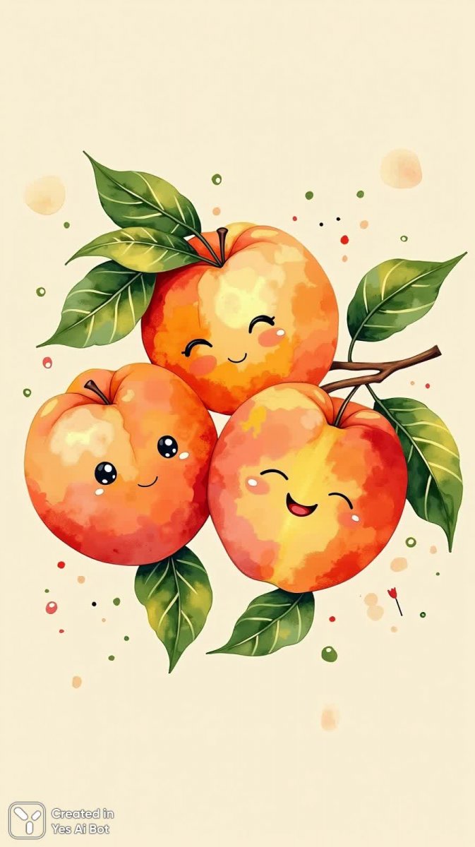 #3. naive art depicting three juicy peaches arranged in a playful circle, one peach showing a cute smiling face, adorned with green leaves, BG is light cream with polka dots #role_coloring_book