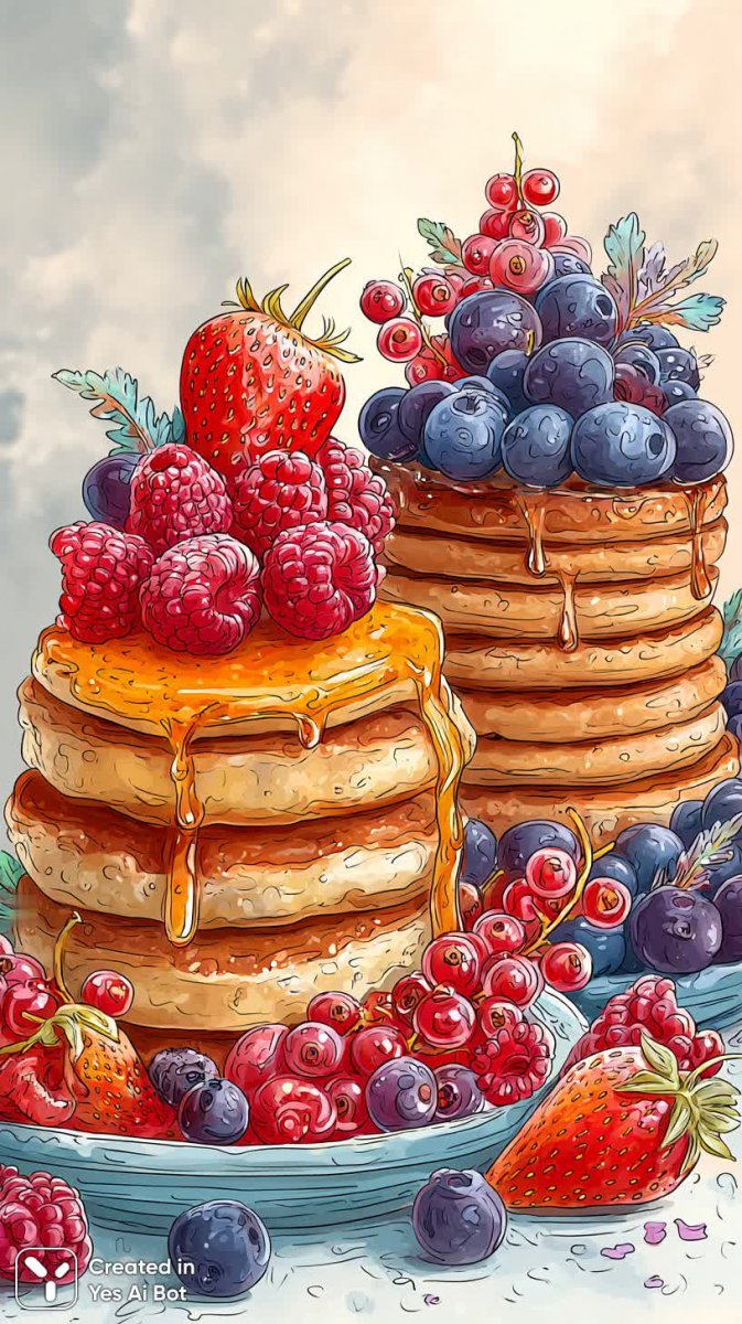 midjourney Сладкие стопки блинчиков с ягодами и сиропом. Картинка из нейросети Midjourney