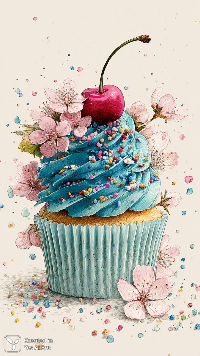 doodling of a whimsical cupcake with blue frosting, decorated with multicolored sprinkles and a cherry on top, surrounded by petals and small flowers, BG is white with scattered dots, playful and inviting feel.