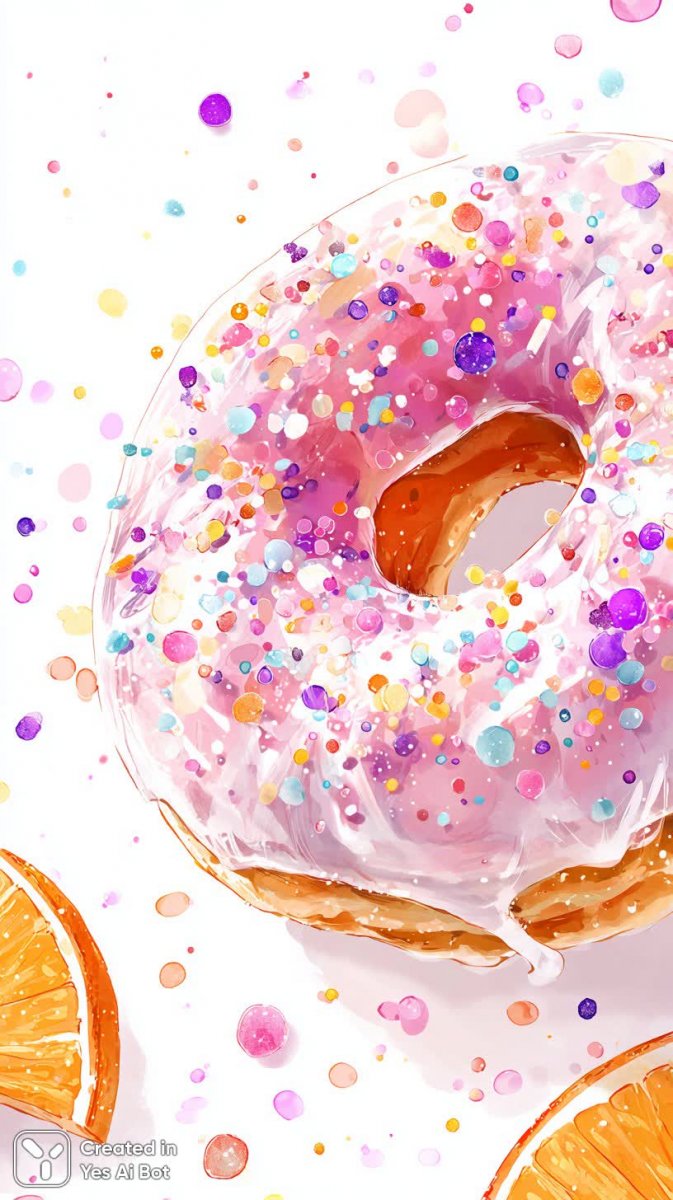 Забавный и яркий рисунок в мультяшном стиле изображает аппетитный пончик. Черно-белая основа украшена пестрыми разноцветными посыпками – зелеными, фиолетовыми, розовыми и другими жизнерадостными оттенками. Фон выполнен в белом цвете, что подчеркивает насыщенность красок самого десерта и создает ощущение легкости и воздушности. В правом нижнем углу заметен ломтик апельсина, добавляющий композиции динамизма и свежести. Рисунок выполнен с использованием техники тушевой графики, что придает ему особую нежность и мягкость. Визуальный стиль работы – игривый и беззаботный, он вызывает улыбку и положительные эмоции. Этот пончик выглядит невероятно аппетитным и привлекательным, словно приглашая его попробовать. Он идеально подойдет для оформления детских товаров, кулинарных блогов или просто в качестве милого украшения интерьера. Изображение передает атмосферу радости, веселья и сладостей, а продуманные детали делают его особенно запоминающимся и оригинальным. Такая иллюстрация станет отличным способом подчеркнуть креативность и индивидуальность вашего проекта, добавив ему нотку юмора и позитива
