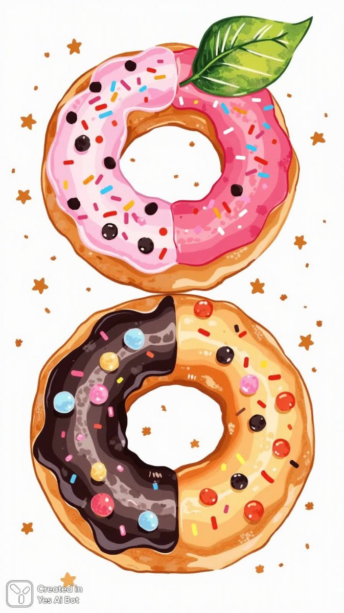 #3. naive art, colorful illustration of three donuts arranged in triangular formation, one donut on left covered in pink sprinkles, center donut with black dots, top donut adorned with a green leaf, BG is white with small stars scattered around #role_coloring_book