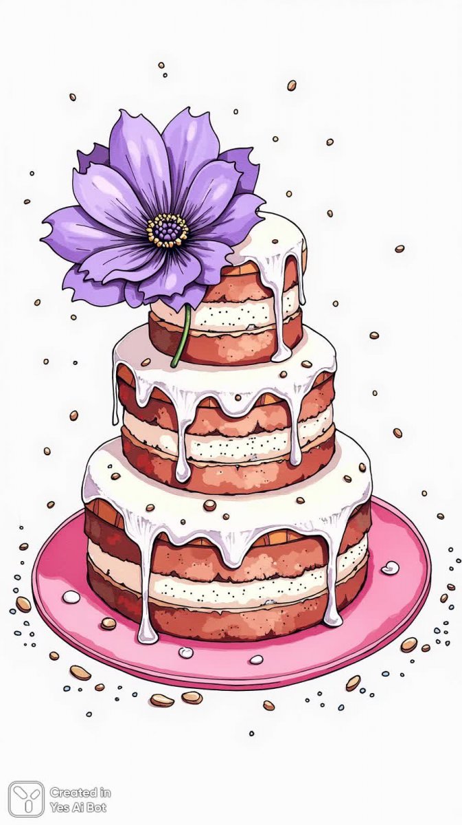 Торт с фиалкой: изящная иллюстрация для раскраски взрослых и детей - Картинка, полученная с помощью нейросети Flux 1