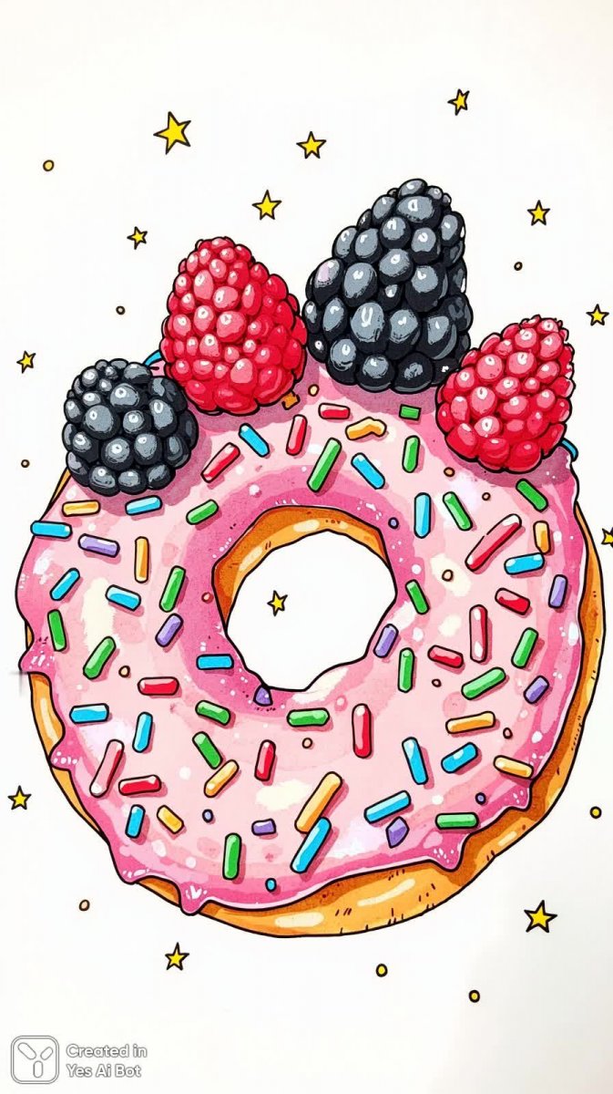 Яркий пончик с ягодами и разноцветными брызгами: сладкая иллюстрация для раскрашивания - Картинка, созданная нейросетью Flux 1