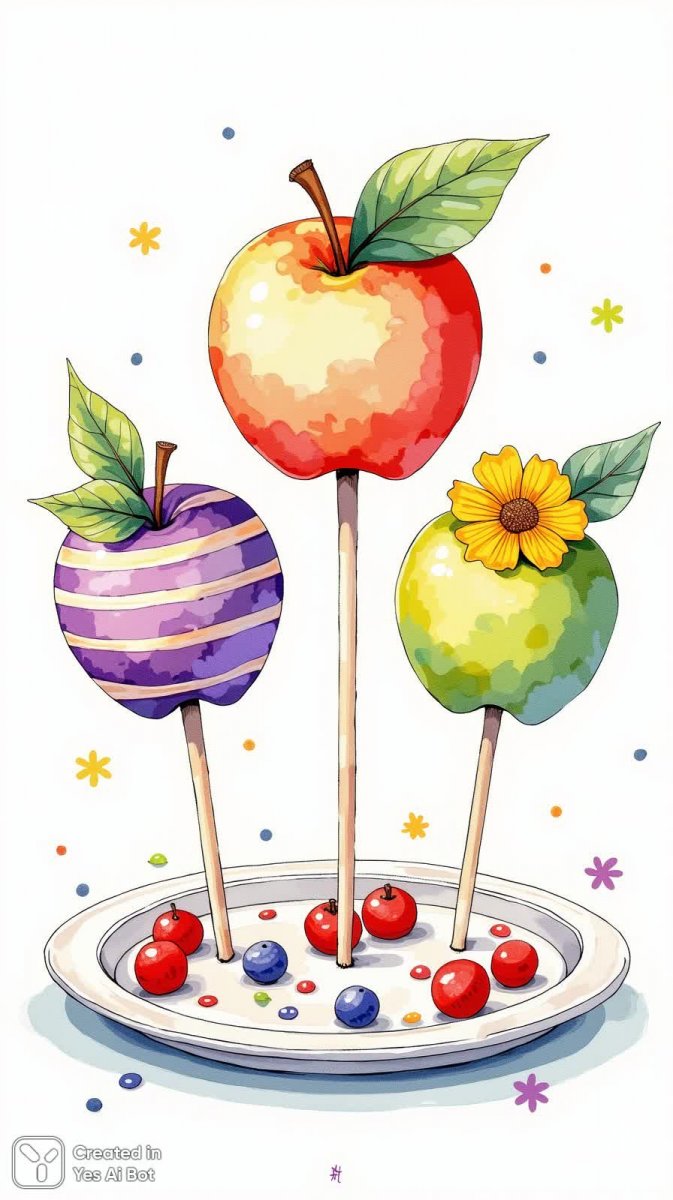 #4. folk art, cartoonish, colorful illustration of three apples on lollipops arranged in triangular formation, one apple covered in striped pattern of purple, top apple adorned with green leaf and yellow flower, plate decorated with scattered berries, whimsical playful style #role_coloring_book