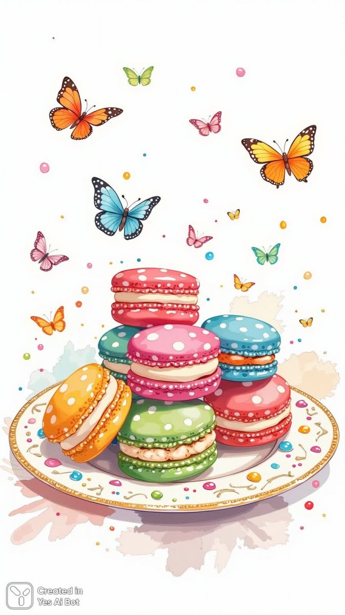#4. doodling illustration of macarons placed on a fancy plate, each macaron uniquely patterned with stripes and polka dots in vibrant colors, tiny butterflies fluttering around, BG is white with soft watercolor-like splashes, whimsical and light-hearted style #role_coloring_book