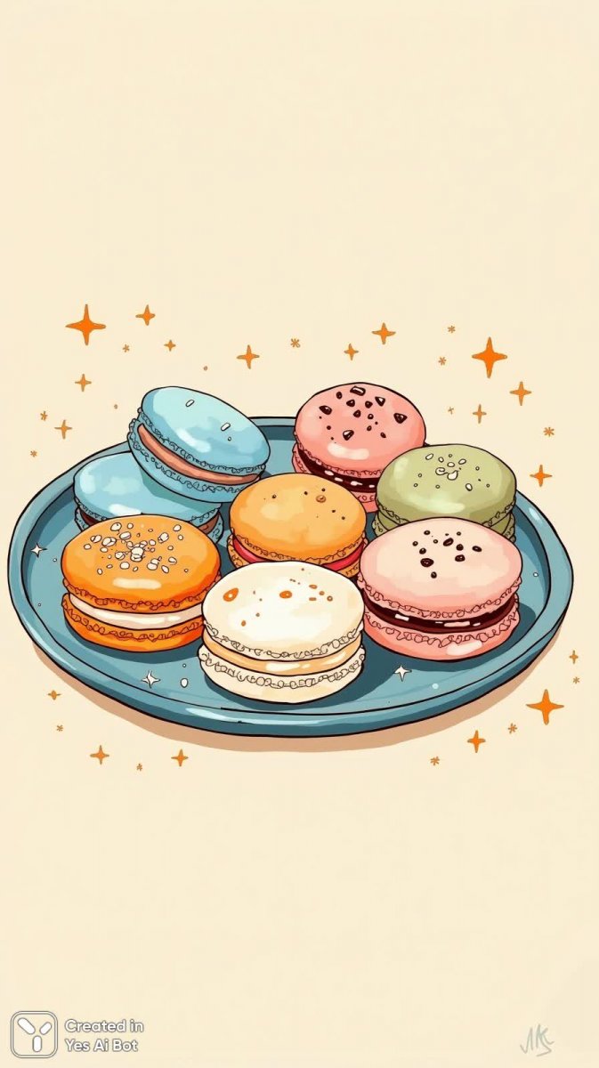 #2. cartoonish illustration of a whimsical tray filled with assorted macarons, each having unique flavors and colors like pastel blue, soft orange, and creamy white, decorated with tiny sparkling stars and sprinkles, BG is light beige, inviting and cheerful style #role_coloring_book