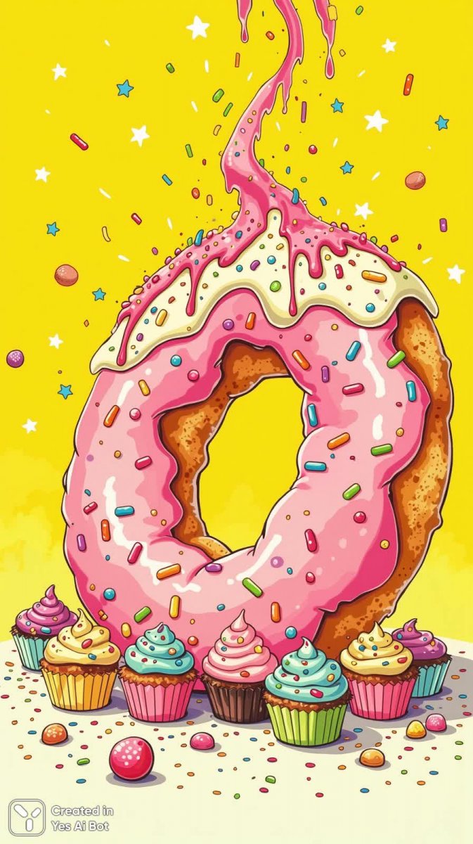 Яркая и игривая иллюстрация, представляющая собой огромный пончик, словно сошедший со страниц красочной раскраски. Пончик выполнен в мультяшном стиле с обилием ярких разноцветных посыпок, создающих ощущение праздника и веселья. Сверху аппетитно стекает разноцветное глазурное покрытие, добавляя изображению дополнительную привлекательность и сладость. Вокруг пончика расположились маленькие кексики и конфеты, образующие композицию, полную радости и детской непосредственности. Фон выполнен в солнечно-желтом цвете, который подчеркивает яркость и жизнерадостность изображения. Небольшие нарисованные от руки звездочки, хаотично разбросанные по всему фону, добавляют картине легкости и воздушности, создавая ощущение волшебной сказки. Вся иллюстрация пронизана атмосферой веселья и радости, идеально подходящей для использования в качестве иллюстрации к детской книге или раскраске, способствуя развитию творческих способностей и воображения юных художников. Эта работа воплощает собой сладкие мечты и безграничное удовольствие от ярких красок и аппетитных сладостей. Она вызывает улыбку и дарит позитивные эмоции, словно кусочек солнечного дня