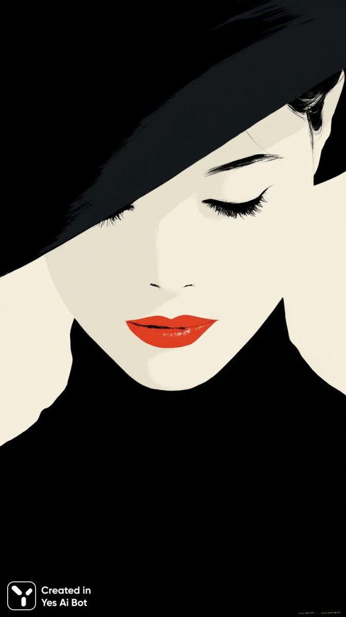 Элегантный минималистичный портрет женщины с закрытыми глазами воплощает собой утонченную красоту и загадочность. Графическая иллюстрация акцентирует внимание на деталях: яркая красная помада на губах, широкая черная шляпа, небрежно надвинутая набок, создают образ стильной и уверенной в себе личности. Фон выполнен в черно-белую полоску, добавляя динамики и контраста изображению. Использование простых геометрических форм и плоского векторного стиля придает работе современный и лаконичный вид. Это не просто портрет, а скорее художественная интерпретация женственности, где каждый элемент тщательно продуман для создания гармоничного и запоминающегося образа. Вся композиция пронизана ощущением спокойствия и внутренней силы. Подчеркнутая сдержанность в деталях позволяет зрителю сосредоточиться на выражении лица и общей атмосфере загадочности. Работа идеально подойдет для оформления различных дизайнерских проектов, где требуется сочетание элегантности и минимализма. Это визуальное воплощение стиля и вкуса, способное украсить любое пространство и привлечь внимание своей простотой и изысканностью. Иллюстрация излучает спокойствие и умиротворение, приглашая зрителя заглянуть в мир грез и фантазий