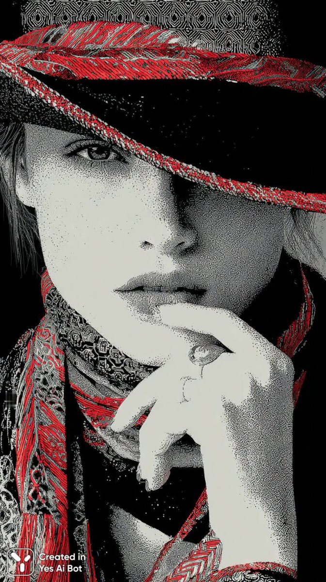 Портрет загадочной женщины в черно-белой гамме пленяет своей элегантностью и минимализмом. Акцент на ярких алых губах создает сильный визуальный контраст с монохромной палитрой изображения, приковывая взгляд к выразительному лицу. Широкополая черная шляпа с красными акцентами добавляет образу драматизма и загадочности, подчеркивая утонченность стиля. Рука, покоящаяся на подбородке, передает задумчивость и внутреннюю сосредоточенность модели. Плоские формы и четкие линии создают ощущение графичности и лаконичности, характерные для современной эстетики. Простой фон с ненавязчивым узором не отвлекает внимание от главного объекта – лица женщины, позволяя зрителю полностью погрузиться в атмосферу таинственности и изысканности. Этот портрет – это игра света и тени, формы и цвета, воплощенная в минималистичном стиле, которая оставляет неизгладимое впечатление своей сдержанной красотой и глубиной. Он словно приглашает зрителя разгадать тайну этой женщины, почувствовать ее внутренний мир и прикоснуться к миру высокой моды и изысканного вкуса. Изображение излучает уверенность и независимость, создавая образ сильной и загадочной личности
