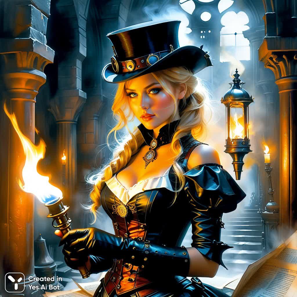 Тёмная фантазия: девушка с факелом в стимпанк подземелье, акварельные этюды и наследие Винсенте Ромеро Редондо - Пример изображения из нейросети Stable Diffusion