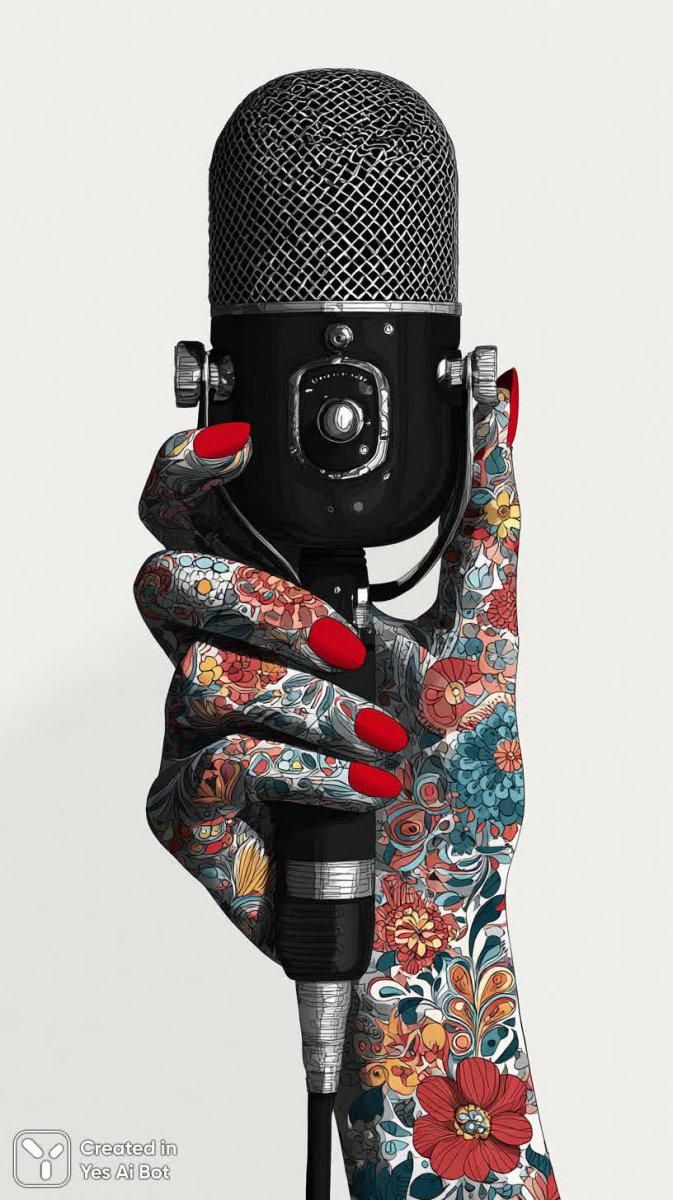 hand holding black mic, red nails, flat and minimalistic, illustration style bold and striking, white background, simple shapes, playful vibe with accents of red.