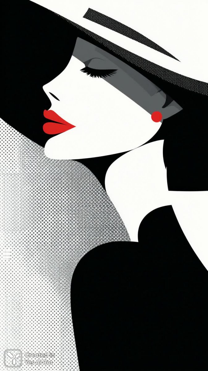 Элегантный черно-белый портрет женщины в минималистичном стиле завораживает своей простотой и изысканностью. Акцент на ярко-красных губах создает яркий контраст с монохромной палитрой, притягивая взгляд и подчеркивая чувственность образа. Широкополая шляпа, слегка наклоненная набок, добавляет загадочности и шарма. Волосы, аккуратно уложенные в стильный боб, выполнены из простых геометрических форм, что характерно для лаконичного дизайна. Фон, состоящий из ненавязчивого полосатого рисунка, не отвлекает внимание от главного объекта – лица женщины, а лишь подчеркивает его графическую выразительность. Изображение выполнено в технике плоских форм, создавая ощущение двумерности и усиливая эффект минимализма. Это произведение искусства является прекрасным примером сочетания простоты, элегантности и яркого акцента, воплощенных в графической иллюстрации. Оно идеально подойдет для тех, кто ценит современный дизайн и лаконичные образы, способные рассказать историю без лишних деталей. Вся композиция дышит утонченностью и изяществом, делая этот портрет незабываемым и запоминающимся. Он передает атмосферу спокойствия и уверенности в себе