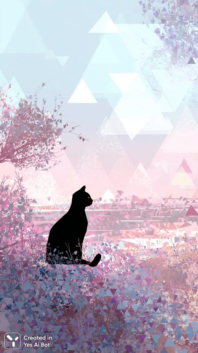 minimalistic illustration of a black and white cat with pastel-colored background, featuring soft curves and geometric shapes, sitting on a pattern of pink triangles, playful and whimsical feel, vector art, png.
