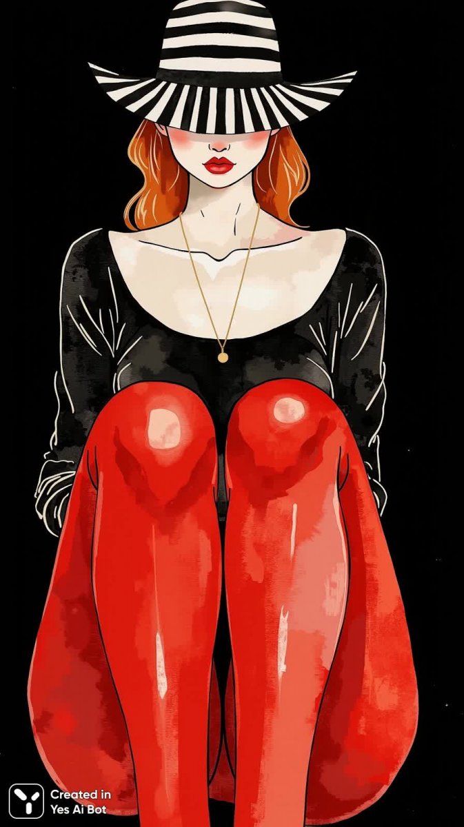 Загадочная элегантность в черно-белом ключе. Перед зрителем предстает изящная дама, грациозно устроившаяся скрещенными ногами. Ее образ соткан из контрастов: дерзкие красные колготки смело сочетаются с причудливой черно-белой полосатой шляпой, создавая эффектную визуальную игру. Лицо изображено в стиле минимализм, что подчеркивает лаконичность и утонченность композиции. Ярким акцентом выступает алый оттенок на губах, словно намек на скрытую страсть и внутреннюю силу. Простота форм и четкость линий создают ощущение гармонии и сбалансированности. Фон в глубоком черном цвете усиливает драматизм сцены, выделяя фигуру женщины и придавая ей ореол таинственности. Вся картина пронизана духом творчества и самовыражения, а красный цвет играет роль ключевого элемента, символизируя энергию, уверенность и неповторимость образа. Это не просто портрет – это визуальная поэма о красоте, стильности и загадочности женской натуры, представленная в лаконичной и запоминающейся форме. Использование ограниченного количества цветов и простых геометрических фигур позволяет зрителю сосредоточиться на самом главном – на выражении лица и общей атмосфере произведения, создавая ощущение сопричастности к чему-то большему