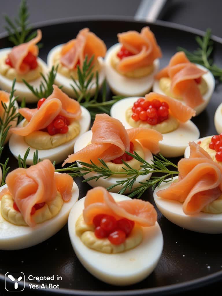 Изысканная закуска: яйца с лососем и кремом – воплощение гастрономического искусства - Изображение, созданное нейросетью Flux Ai