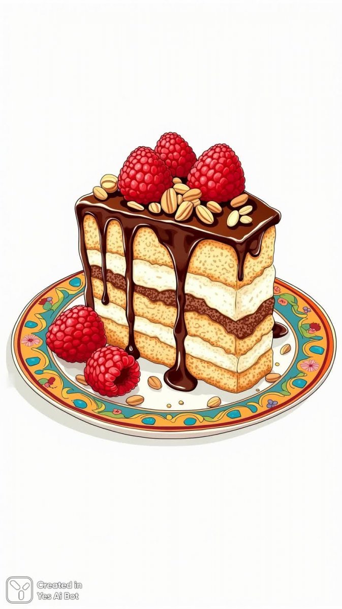 #5. paper cut gouache illustration of a slice of cake with layers of chocolate and vanilla, drizzled with caramel, topped with nuts and fresh raspberries, displayed on a decorative plate with a colorful border, BG is white #role_coloring_book