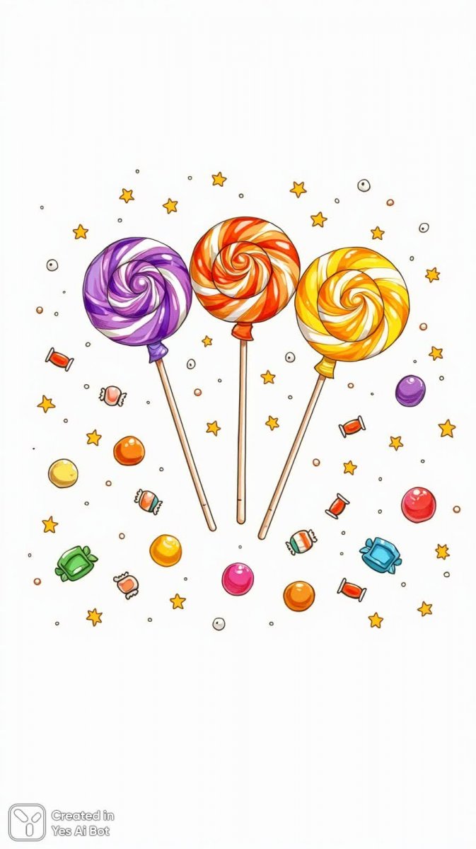Яркая и жизнерадостная иллюстрация, выполненная в мультяшном стиле, представляет собой три красочных леденца, аккуратно выстроенных в ряд. Каждый леденец привлекает внимание своим уникальным дизайном и насыщенными цветами, создавая ощущение праздника и веселья. Центральный леденец выделяется необычным полосатым узором, сочетающим смелые оттенки фиолетового, оранжевого и желтого – настоящий взрыв цвета! Вокруг леденцов хаотично разбросаны маленькие конфеты и сверкающие звездочки, добавляя композиции игривости и динамичности. Фон выполнен в чистом белом цвете, что позволяет ярким краскам леденцов максимально раскрыться и привлекать внимание зрителя. Вся иллюстрация пронизана атмосферой радости, позитива и детской непосредственности – идеальный выбор для создания веселой и запоминающейся картинки. Эта работа прекрасно подойдет для оформления раскрасок, открыток или других детских товаров, где важна яркая цветовая гамма и игривый сюжет. Она излучает тепло и хорошее настроение, вызывая улыбку и желание порадоваться простым вещам. Иллюстрация словно приглашает в мир сладостей и фантазий, где каждый может почувствовать себя ребенком!